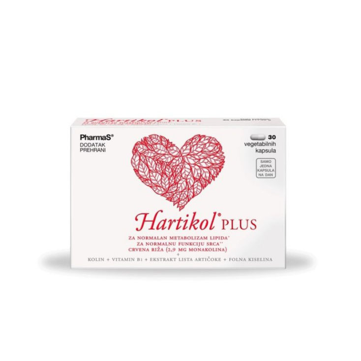 Hartikol plus je prirodni dodatak koji sadrži kombinaciju: crvena riža (2,9 mg monakolina) + kolin + vitamin B1 + ekstrakt lista artičoke + folna kiselina.