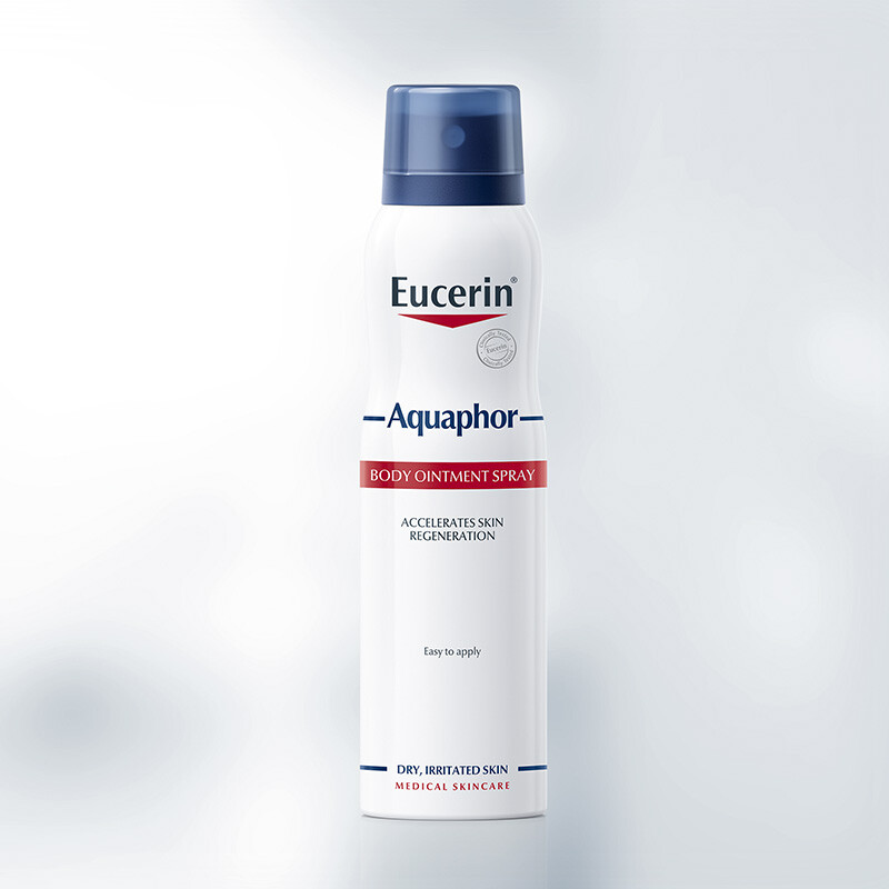 Kada se naruši prirodna barijerna funkcija kože, ona postane osjetljivija na spoljne uticaje. Za jednostavni i trenutni osjećaj hlađenja i olakšanja na većim površinama tijela, formulisan je Eucerin Aquaphor sprej. Inovativna boca za sprej dozvoljava potpun doseg bilo gdje na tijelu. Ona omogućava kontinuirano i jednostavno nanošenje masti i može se koristiti i u položaju naopačke, što dozvoljava doseg od 360° i mogućnost da se dopre do suve kože bilo gdje na tijelu. Mast koja ne sadrži vodu klinički dokazano obnavlja suvu, iritiranu kožu tako što formira izvanrednu zaštitnu barijeru za regeneraciju kože i stvara trenutni osjećaj hlađenja i olakšanja. Sama formulacija obogaćena je glicerinom i pantenolom kako bi pomogla koži da zadrži vlažnost i kako bi se poboljšali regeneracija i oporavak. Bez konzervansa i bez parfema, ova mast u spreju za hitnu njegu je hidratantno sredstvo koje klinički dokazano pruža olakšanje veoma suvoj koži. Nakon korišćenja spreja, koža postaje vidljivo regenerisana, zaštićena i obnovljena.