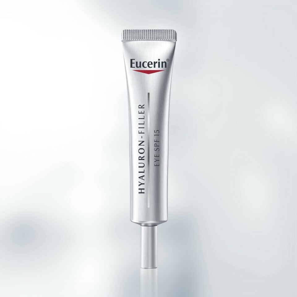 Eucerin Hyaluron filler krema za područuje oko očiju sadrži kombinaciju kratkih i dugačkih lanaca molekula hijaluronske kiseline. Hijaluronska kiselina velike molekulske mase djeluje u gornjim slojevima kože i popunjava fine bore, dok hijaluronska kiselina male molekulske mase prodire dublje u kožu i popunjava duboke bore. Glicin saponini stimulišu sintezu hijaluronske kiseline u ćelijama kože gdje se najdublje bore formiraju. SPF 15+, sa UV zaštitom sprečava prevremeno starenje i produbljivanje bora oko očiju.