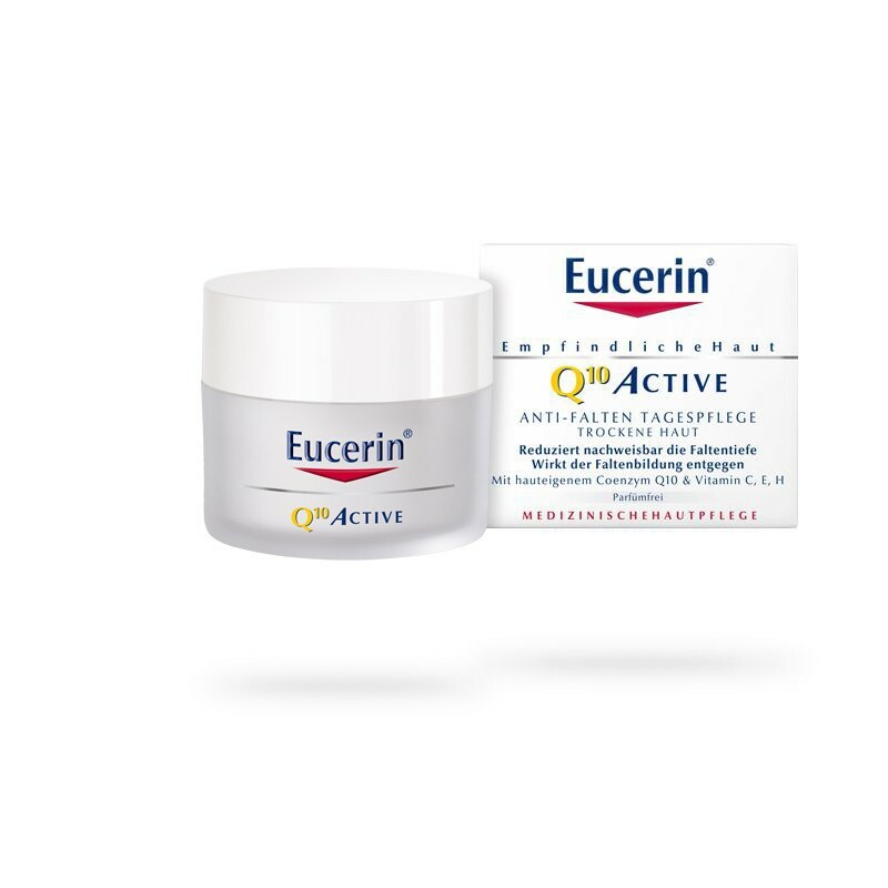 Eucerin Q10 active dnevna krema za suvu kožu je specijalno formulisana sa koenzimom Q10, koji ćelijama daje energiju i sprečava nastanak bora na osjetljivoj koži. Sadrži antioksidanse vitamine C, E i H (biotin), koji hrane suvu kožu i smanjuju upale, tako da je koža bolje zaštićena od dejstva slobodnih radikala. Ne sadrži parabene, vještačke boje, parfeme i alkohol, pa je pogodna za osjetljivu kožu.