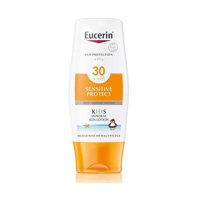 Eucerin Sun dječiji losion sa mikropigmentima SPF 30 150 ml. Prikladno od 3 mjeseca starosti. Eucerin Sensitive protect kids mineral losion za zaštitu dječije kože od sunca SPF 30 mogu koristiti djeca od 3 mjeseca starosti. Štiti od opekotina i smanjuje rizik od oštećenja kože uzrokovanog suncem. Bez hemijskih filtera, širokopojasni i fotostabilni sistem mineralnog filtriranja nudi visoki faktor zaštite s mikropigmentima koji reflektiraju UVA/UVB zrake izravno s površine kože. Mineralni losion za zaštitu od sunca također uključuje gliceretiničnu kiselinu koja podržava vlastiti mehanizam obnavljanja DNA kože. Mineralni losion za zaštitu od sunca takođe uključuje gliceretiničnu kiselinu koja podržava vlastiti mehanizam obavljanja DNA kože. Formula ne sadrži parfem i dodatno je otporna na vodu. Eucerin Sensitive protect kids mineral losion za zaštitu dječije kože od sunca SPF 30 klinički je i dermatološki prikladna za osjetljivu kožu djece.