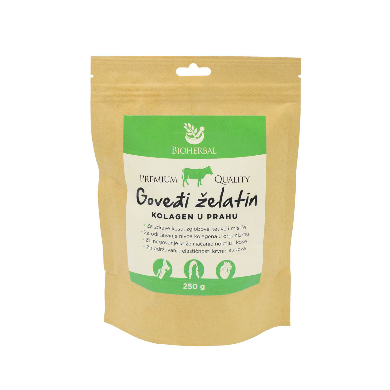 Goveđi želatin u prahu 250 g je posebno djelotvoran kod oštećenja zglobova – koljena, kuka, ramena, kičme, kao i kod kostobolje i kada je oštećena hrskavica. U sebi posjeduje dvije aminokiseline, prolin i hidrosiprolin koji imaju pozitivan učinak na oporavak vezivnog tkiva djeluju na stanje vezivnih vlakana i sitnih krvnih žila, a također može povećati rast i obim vezivnog tkiva – kod povreda mišićnih tetiva i ligamenata. Svojim kostima možete pomoći i na prirodan način, namirnicama poput želatina i kvalitetnom ishranom.