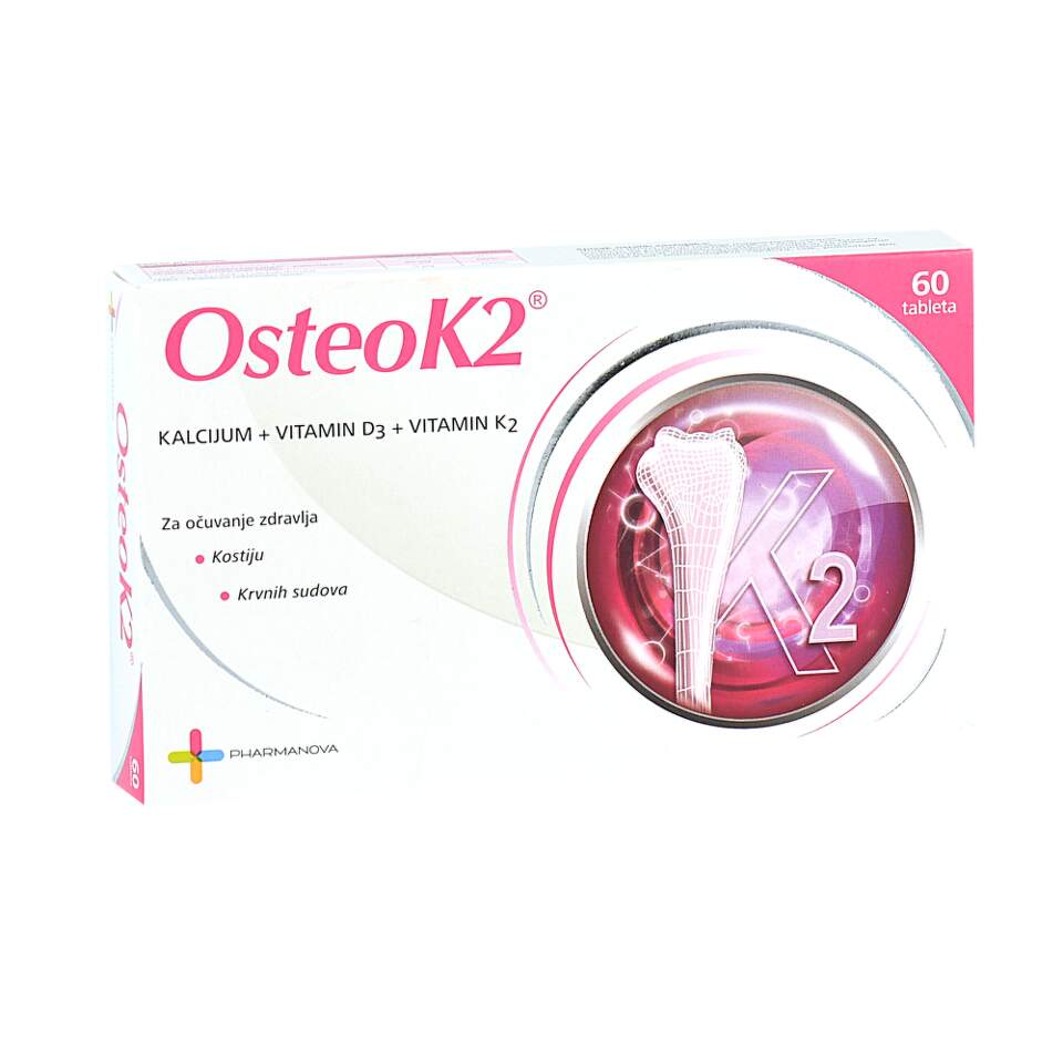 Osteo K2 je dodatak ishrani namijenjen za pravilnu mineralizaciju kostiju i očuvanje integriteta koštanog sistema. Pored kalcijuma i vitamina D3 sadrži mena Q7, patentirani ekstrakt japanske fermentisane soje Natto, koji predstavlja najbogatiji izvor prirodnog vitamina K. Kalcijum je mineral neophodan za rast i jačanje kostiju, a vitamin D3 omogućava resorpciju kalcijuma iz crijeva. Vitamin K2 je neophodan za pravilno iskorišćavanje resorbovanog kalcijuma i njegovo potpuno ugrađivanje u kosti, kao i za zaštitu krvnih sudova i sprečavanje nastanka kalcifikata.