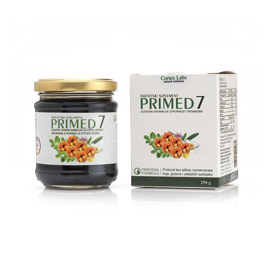 Primed 7 je prirodan preparat, napravljen po provjerenoj recepturi, na bazi meda i ekstrakta zelenih oraha. Ne sadrži vještačke boje, konzervanse i druge aditive. Primed 7 se preporučuje kod: oslabljenje funkcije štitne žlijezde (Hashimoto tireoiditis ili drugi proces koji dovodi do oštećenja funkcije štitne žlijezde), povećane potrebe za unosom joda iz prirodnih izvora. Kako djeluje Primed 7? Prirodan sastav preparata obezbjeđuje dobru apsorpciju i iskorišćenost aktivnih sastojaka. Svakodnevnom upotrebom Primed 7 preparata obezbjeđuje se optimalan dnevni unos joda. Blagotvorno djeluje na simptome koji prate smanjenu funkciju štitne žlijezde, kao dopuna osnovnoj terapiji. Blagotvorno djeluje na usporavanje toka Hashimoto tireoiditisa i pomaže očuvanje funkcije štitne žlijezde.