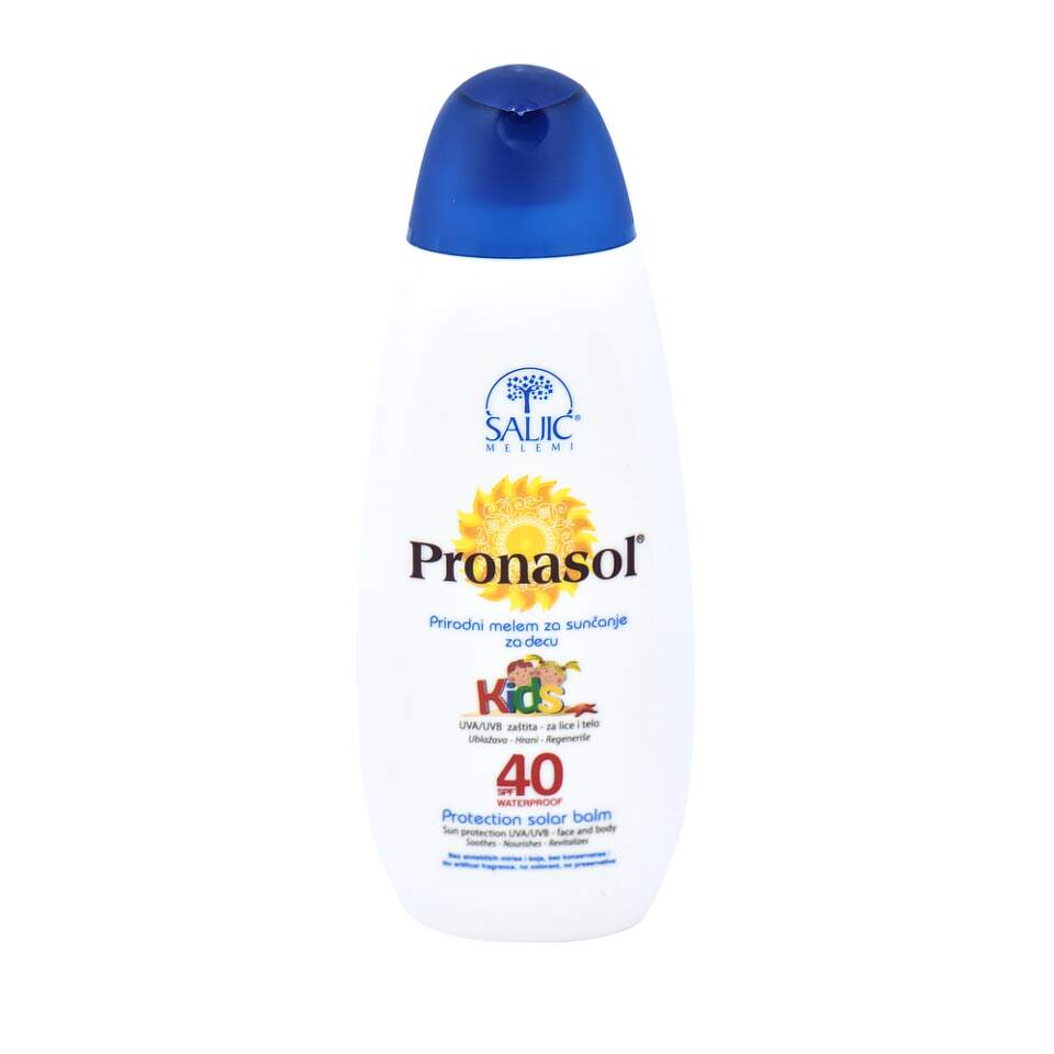 Pronasol kids melem za sunčanje SPF 40 je prirodni melem koji obezbjeđuje četrdeset puta duže izlaganje kože djeteta sunčevim zracima nego bez zaštite. Kombinacija prirodnih sastojaka sa dodatkom ekstrakta kamilice, regeneriše i sprečava perutanje kože izložene dejstvu sunca. Primjenom Pronasol kids melema za sunčanje SPF 40 koža dobija bakarnu boju i ne ljušti se.