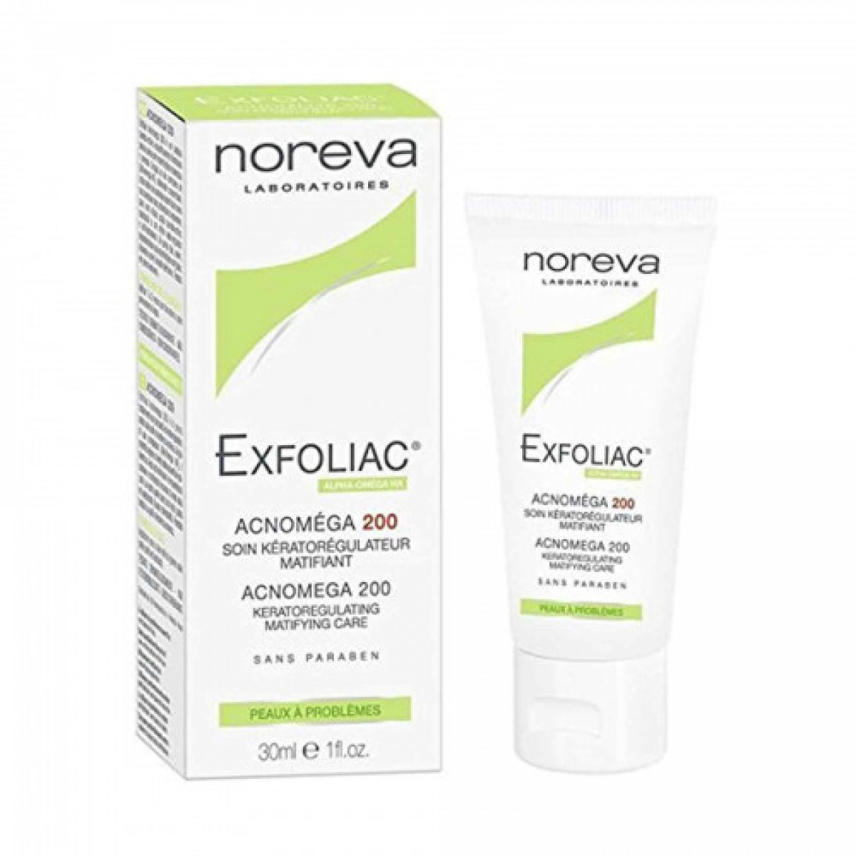 Noreva Exfoliac Acneomega 200 je intenzivna krema koja se koristi u tretmanu masne kože, komedona i težeg oblika akni. Krema djeluje kao piling, čineći kožu glatkom. Smanjeno je lučenje sebuma, mitiseri postaju manje vidljivi, pore su sužene. Zahvaljujući visoko koncentrovanom kompleksu Alfa-Omega Ha ne dovodi do povratnog zadebljanja površinskog sloja kože, ima antibakterijski efekat, reguliše lučenje sebuma. Djeluje na povlačenje mitisera, bubuljica i crvenila, čisti pore ostavljajući Vašu kožu čistom i mekom sa mat efektom. Ne sadrži parabene kao konzervanse, hipoalergijska je, nije fotoosetljiva.
