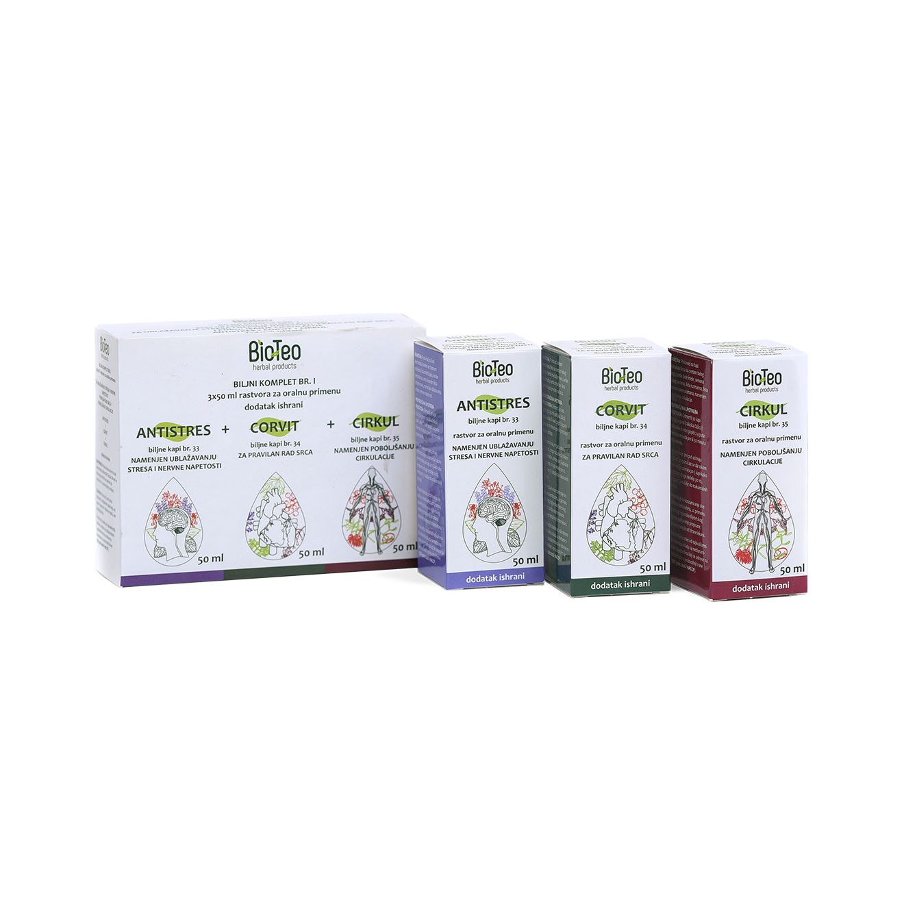 Biljni komplet br. 1 Antistres Corvit Cirkul sastavljen je od 3 različita proizvoda (seta biljnih kapi) na bazi biljnih ekstrakata namijenjen jačanju kardiovaskularnog i nervnog sistema, kao i opštem poboljšanju vitalnosti i otpornosti organizma.