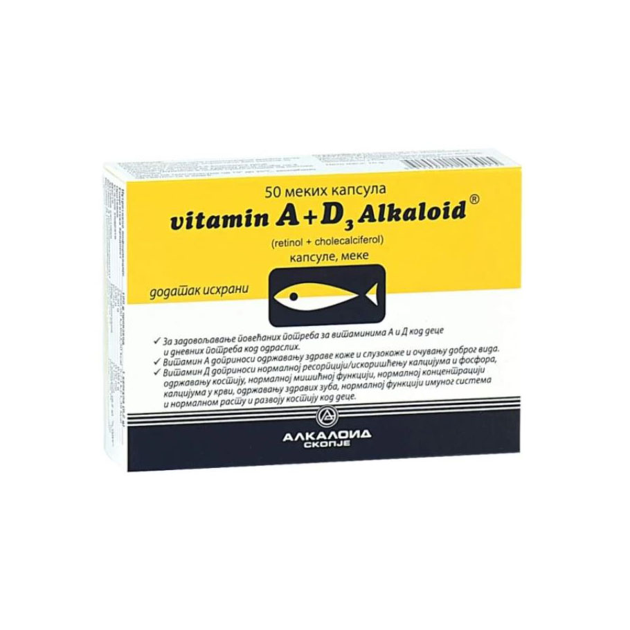 Vitamin A+D3 u mekim želatinoznim kapsulama predstavlja prirodni izvor vitamina A i D i namijenjen je za jačanje imuniteta, održavanje dobrog zdravlja i razvoja kostiju, kože, sluzokože i vida, kod odraslalih i djece starije od 4 godine. Preporučuje se posebno u zimskim mjesecima kada su prehlade i virusne infekcije češće, ali i djeci i odraslima sa slabijim apetitom i kod nepravilne ishrane kada je deficit ovih vitamina moguć.