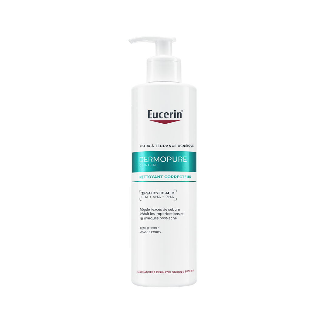 Eucerin DermoPure Gel za čišćenje sa trostrukim efektom sa 2% salicilne kiseline pomaže u borbi protiv nepravilnosti i tamnih fleka od akni, tako što deluje: