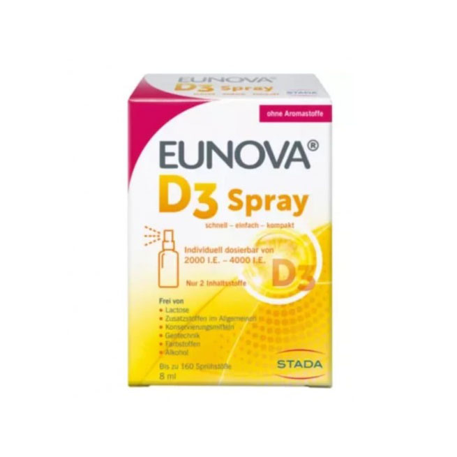 Eunova D3 sprej sadrži 2000 i.j. vitamina D3 u samo jednom potisku spreja i savršeno je rješenje za brzu, efikasnu i praktičnu nadoknadu vitamina D, koji je ključan za mnoge funkcije u tijelu.