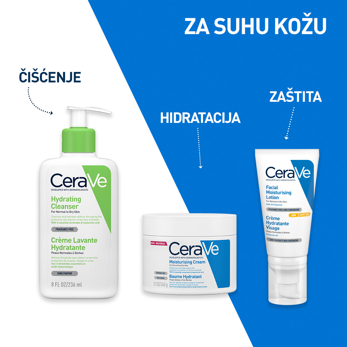 Čisti i hidrira bez narušavanja zaštitne barijere kože lica i tijela. Sadrži 3 esencijalna ceramida i hijaluronsku kiselinu. Za normalnu do suvu kožu. Bez mirisa. Hipoalergeno.